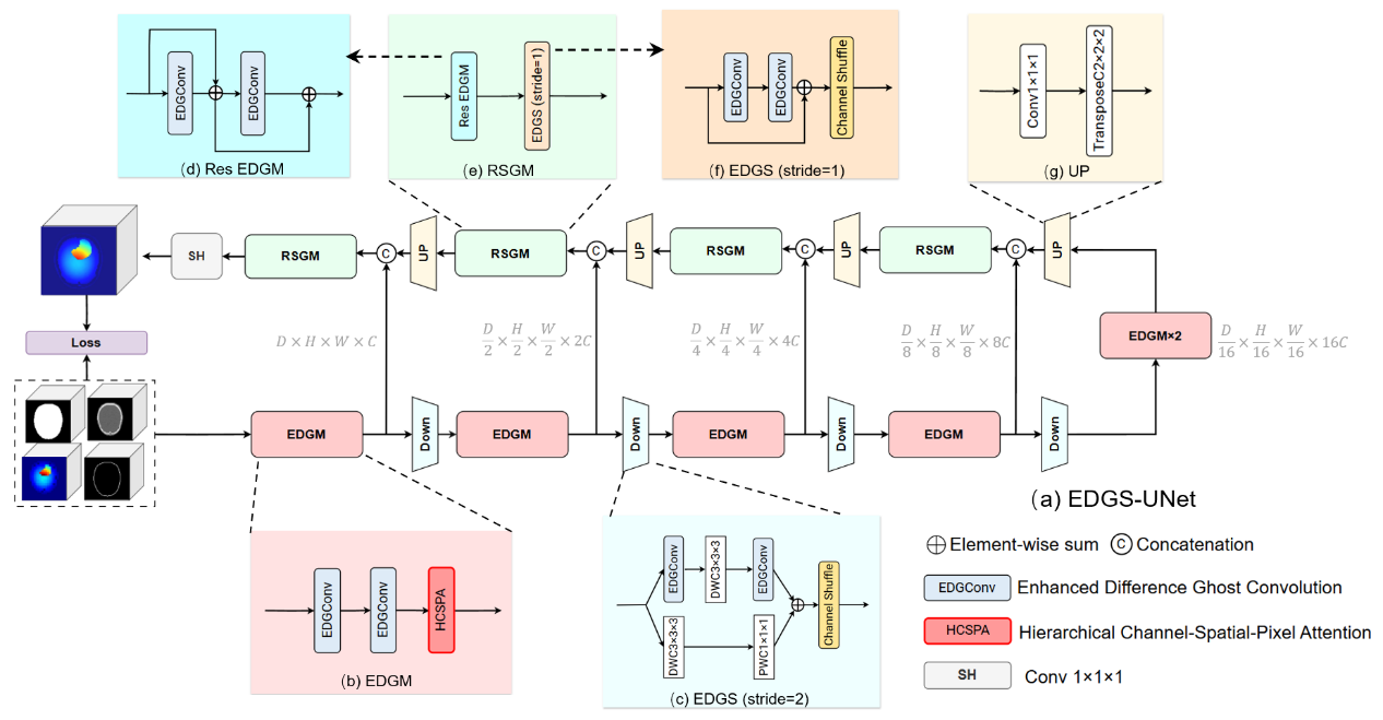 EDGS-UNet架构包含三大创新点:(1)提出了增强微分Ghost卷积(EDGConv),利用差分卷积在不增加计算开销的前提下,将梯度信息有效融入到了特征提取中;(2)引入了分层通道-空间-像素注意力(HCSPA)机制,实现了特征的自适应细化;(3)采用了基于物理的组分特定能量守恒损失函数,严格约束去噪过程符合物理规律,增强了模型的可解释性。