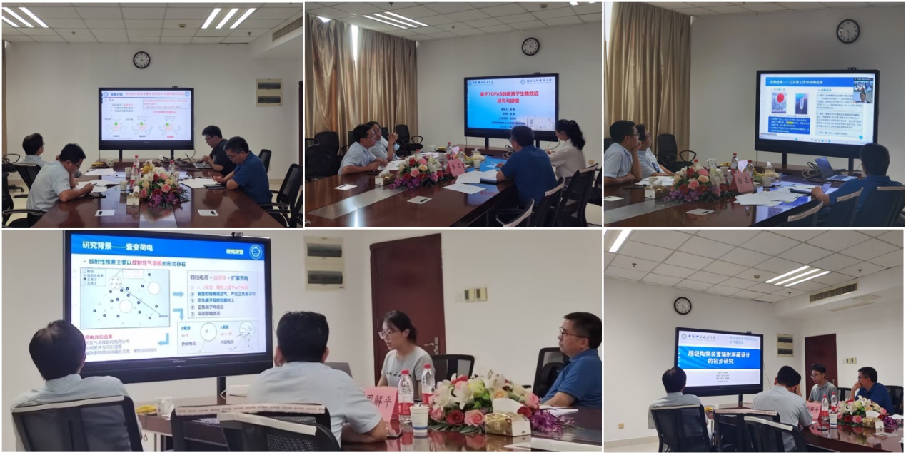 答辩于当天下午15:30正式开始,漆仲禹同学的答辩题目为《一种新型柔性辐射探测器的研究与测试》,张卿同学的答辩题目为《基于TOPAS的碳离子生物效应研究与建模》,郝柏佳同学的答辩题目为《基于Cu(Ⅰ)卤化物纳米发光团簇复合塑料闪烁薄膜的制备与性能研究》,胡笑铖同学的答辩题目为《超级陶粲装置辐射屏蔽设计的初步研究》,王熹同学的答辩题目为《基于衰变荷电效应的放射性气溶胶多物理场耦合输运行为研究》。