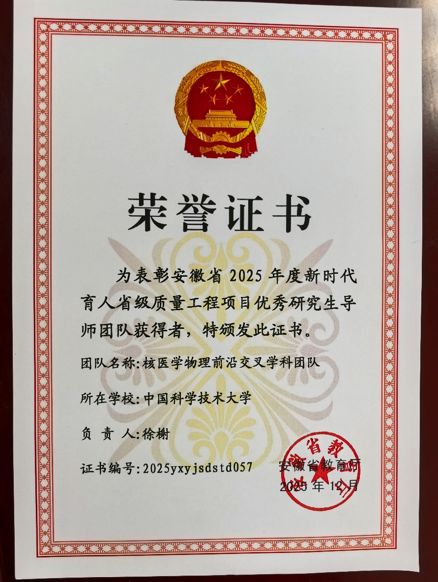 近日,中国科学技术大学核科学技术学院讲席教授徐榭牵头的团队“核医学物理前沿交叉学科团队“荣获安徽省2025年度新时代育人省级质量工程项目优秀研究生导师团队奖(图1), 团队成员包括徐榭(负责人),王雪梅,陈志,吴爱东,苗庆庆,肖正国,姚蓓,周解平,张慧。本省级优秀研究生导师团队立足于“核物理+医学”这一前沿交叉学科,充分发挥中国科大在物理学、核科学与技术和医学等多学科的综合优势,形成了“医工融合”的独特学科特色。核医学物理是集核物理、核技术、核医学、肿瘤放射治疗、医学影像学、光学、信息科学、放射生物、仪器科学、辐射安全等学科的交叉学科。这个领域的科研和临床涉及利用核物理的概念和方法来研发新的诊断和治疗技术和新仪器装备,并借助实时影像技术来研究疾病的发展变化过程,进而开发新的靶向治疗手段,达到改善人类疾病诊疗水平的最终目的。安徽省立医院在2017年并入中国科大为“医工”交叉学科建设带来前所未有的机会和挑战。近十年来,徐榭教授团队依托MED-X:医学物理与生物医学工程交叉学科建设平台(图2),与全校(包括附属第一医院)多个科研方向的老师在交叉科研和人才培养方面取得丰硕的成果。
